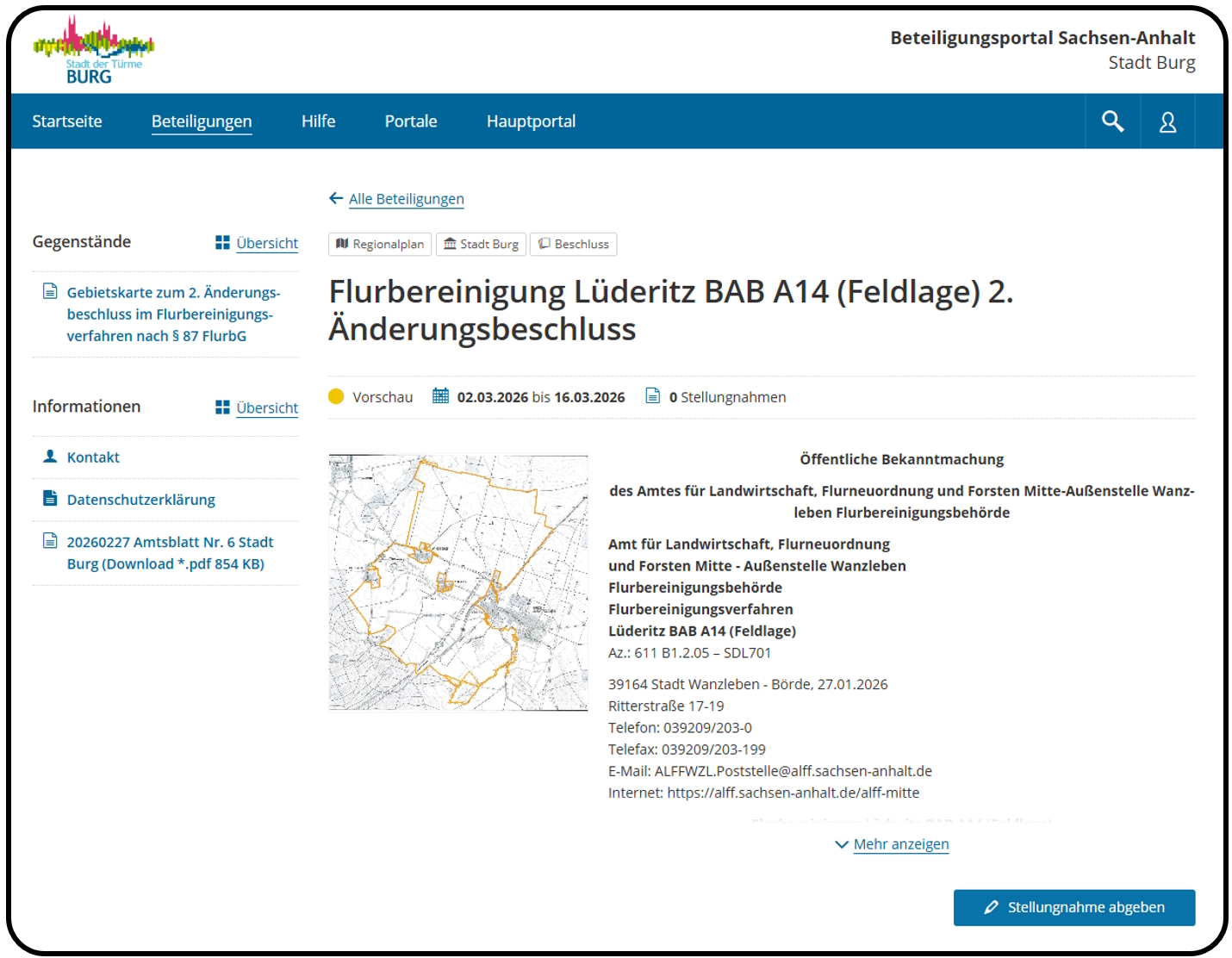 Öffentliche Bekanntmachung des Amtes für Landwirtschaft, Flurneuordnung und Forsten Mitte - Außenstelle Wanzleben Flurbereinigungsbehörde zur Flurbereinigung Lüderitz BAB A14 (Feldlage) 2. Änderungsbeschluss