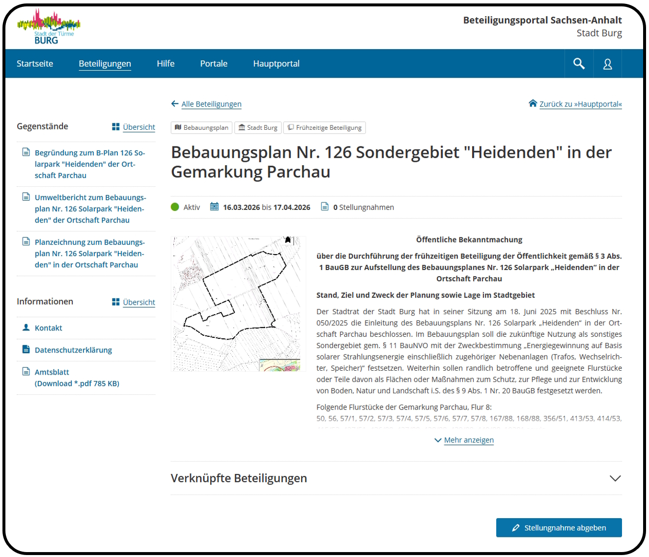 Öffentliche Bekanntmachung über die Durchführung der frühzeitige Beteiligung der Öffentlichkeit gemäß § 3 Abs. 1 BauGB zum Bebauungsplan Nr. 126 Solarpark "Heidenden" in der Ortschaft Parchau