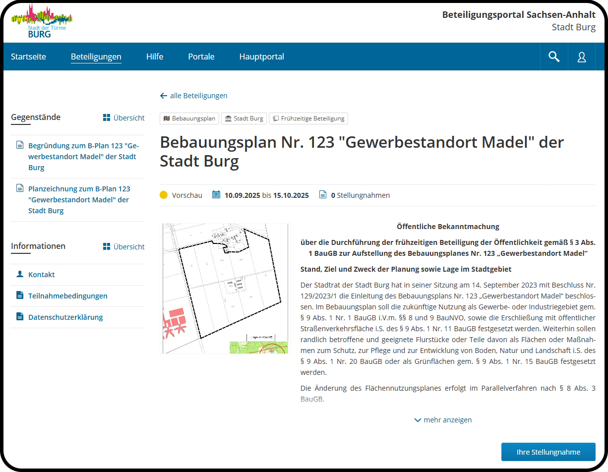 Öffentliche Bekanntmachung über die Aufstellung des Bebauungsplans Nr. 123 der Stadt Burg am "Gewerbestandort Madel" sowie über die Durchführung der frühzeitigen Beteiligung der Öffentlichkeit gemäß § 3 Abs. 1 BauGB