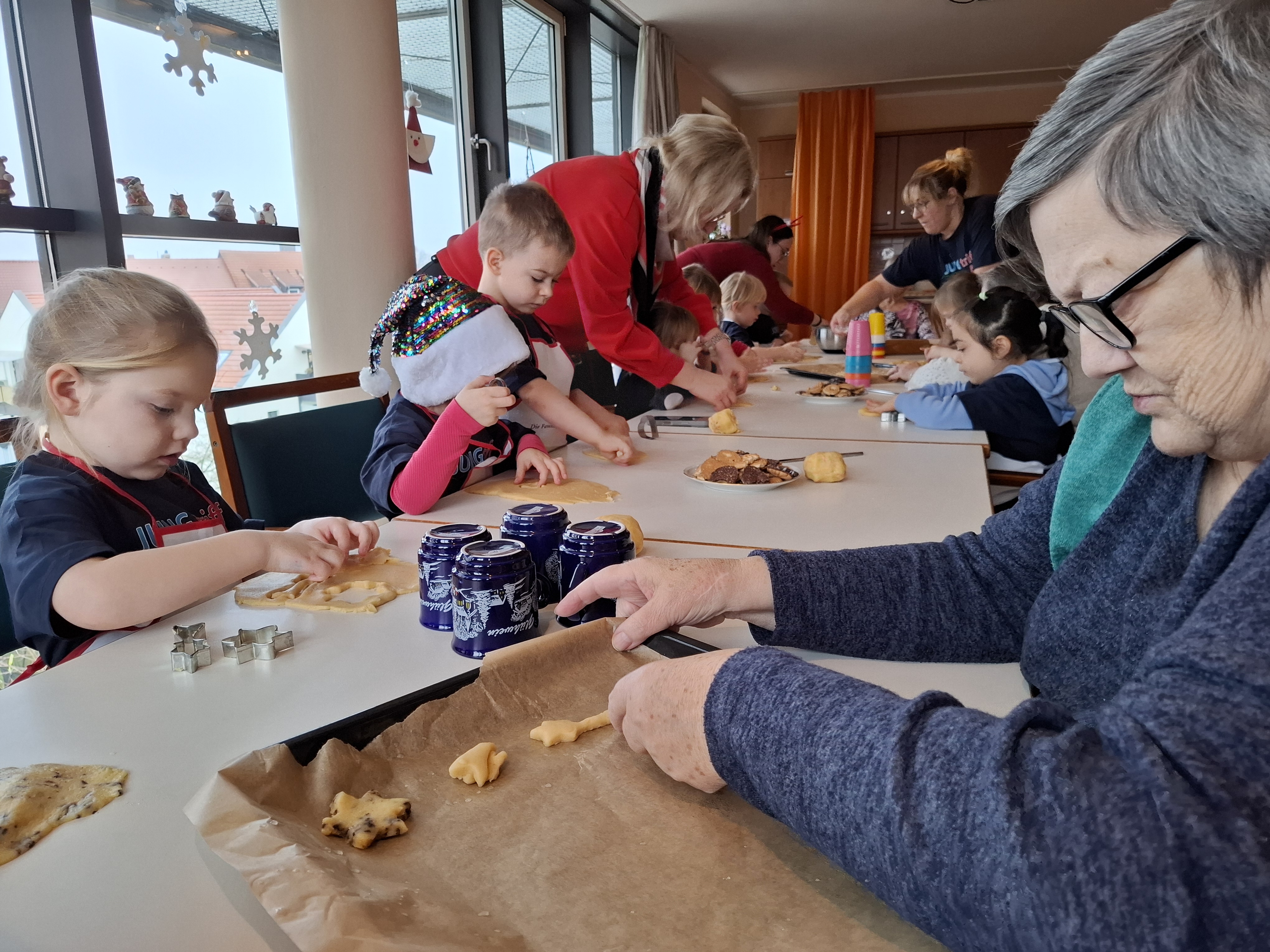Um genau das zu beweisen, gab es nun ein gemeinsames Plätzchenbacken. Und siehe da. Das Nudelholz, die erste große Herausforderung für die Kita-Kinder, wurde schnell zum Werkzeug der Wahl. Die Nutzung gelernt und abgeschaut bei den Senioren. Alsbald hatten die Senioren den Kindern auch das Ausstecken mit Formen gezeigt und die Produktion konnte anlaufen. Mittendrin Burgs Bürgermeister Philipp Stark, der die Kooperation begrüßt und unterstützt. „Wir als Stadt sind eine Gesellschaft unterschiedlicher Altersgruppen und damit Lebensvorstellungen. Es ist gut, wenn diese in gemeinsamen Aktionen und Kooperationen zusammenfinden, um zum einen Verständnis zu entwickeln und zum anderen Erfahrungen auszutauschen“, so Stark.
