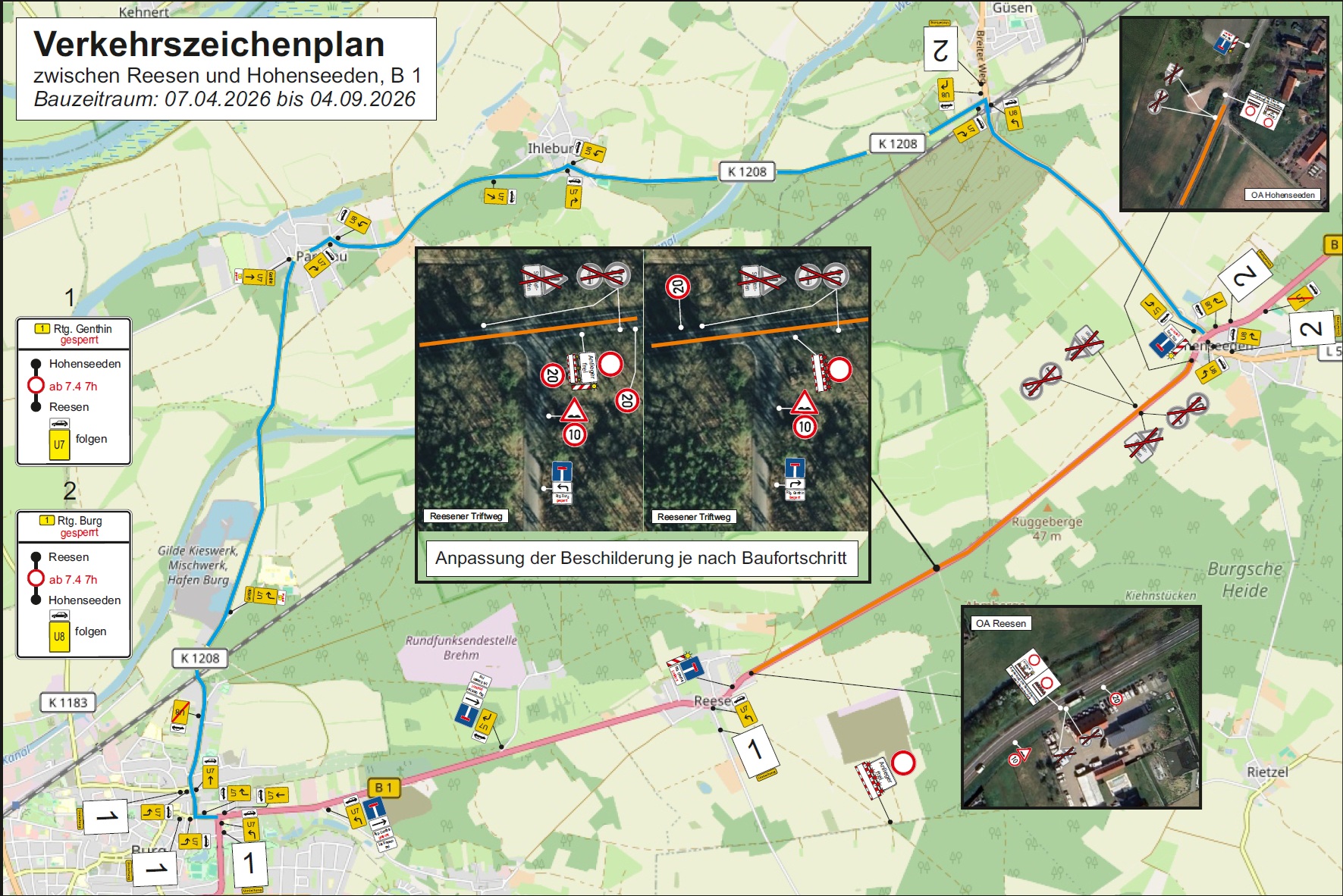 Die LSBB beabsichtigt die Sanierung der B 1 zwischen den Ortschaften Reesen und Hohenseeden auf einer Länge von ca. 5,3 km und die Vollsanierung von 3 Querdurchlässen. Die Maßnahme beginnt in der 15. KW (ab 07.04.2026) und ist am Reesener Triftweg (B 1) in 2 Abschnitte geteilt.