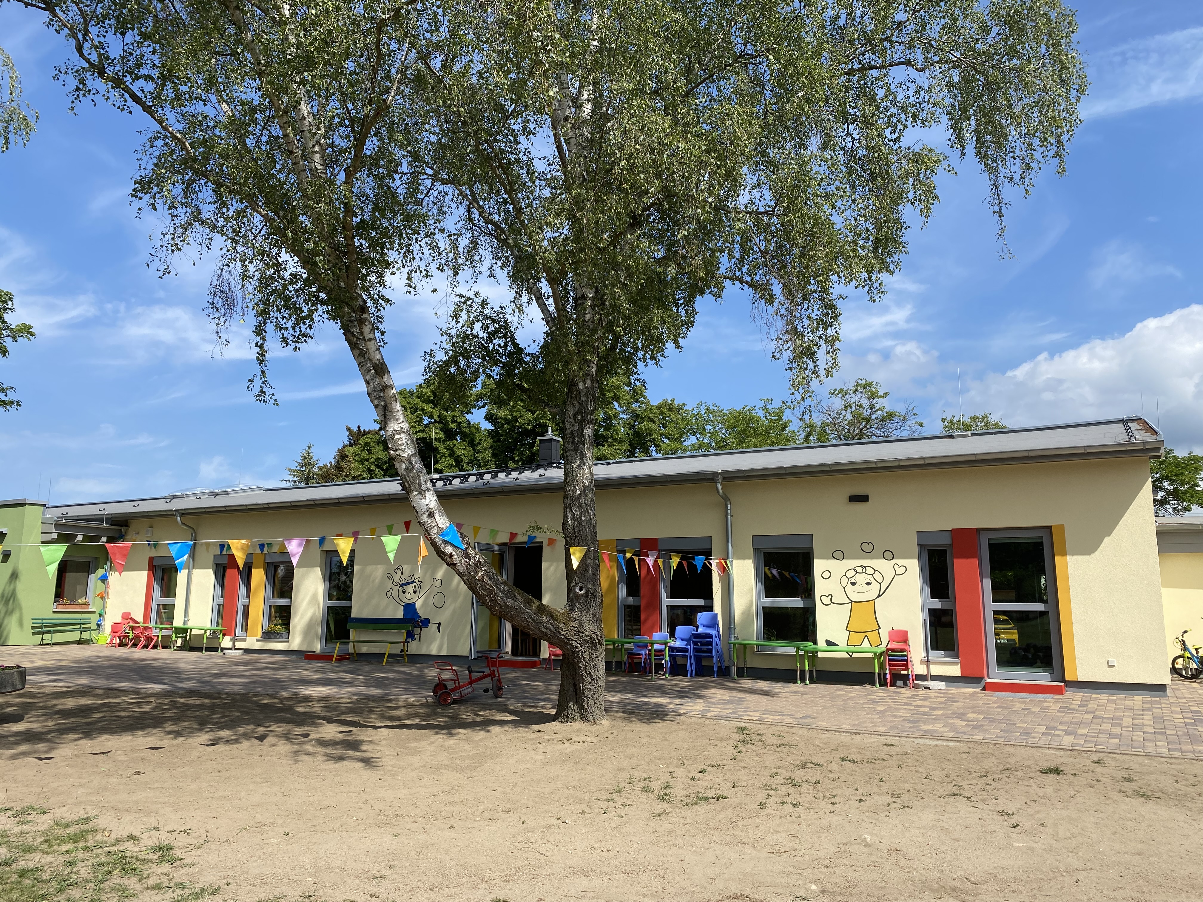 Unsere Einrichtung befindet sich im Ortskern von Parchau, umgeben von Wiesen, Wäldern und dem Parchauer See. Bis zu 54 Kinder im Alter von 0-7 Jahren werden in 3 Gruppen von insgesamt 7 staatlich anerkannten Erziehern betreut.