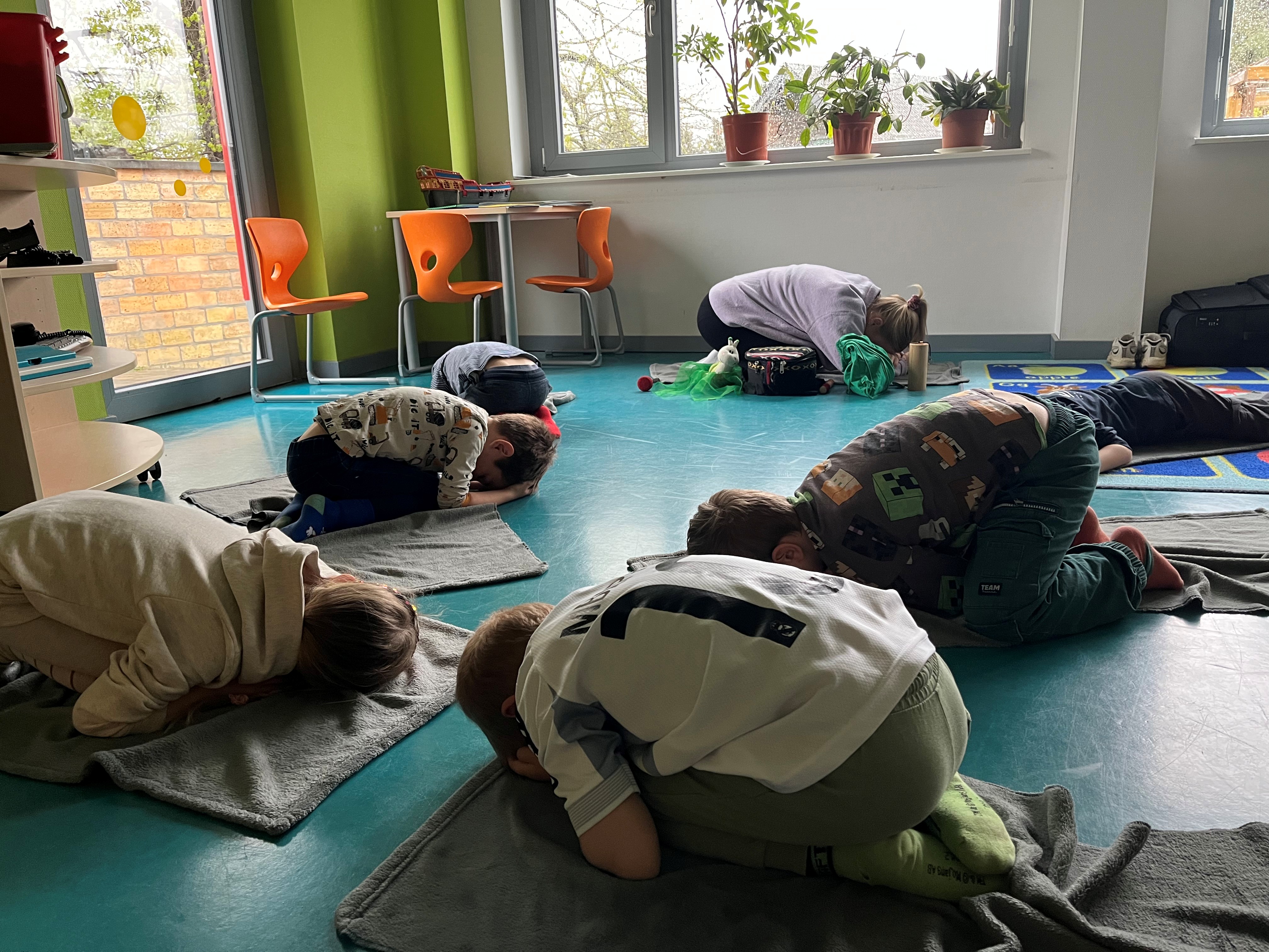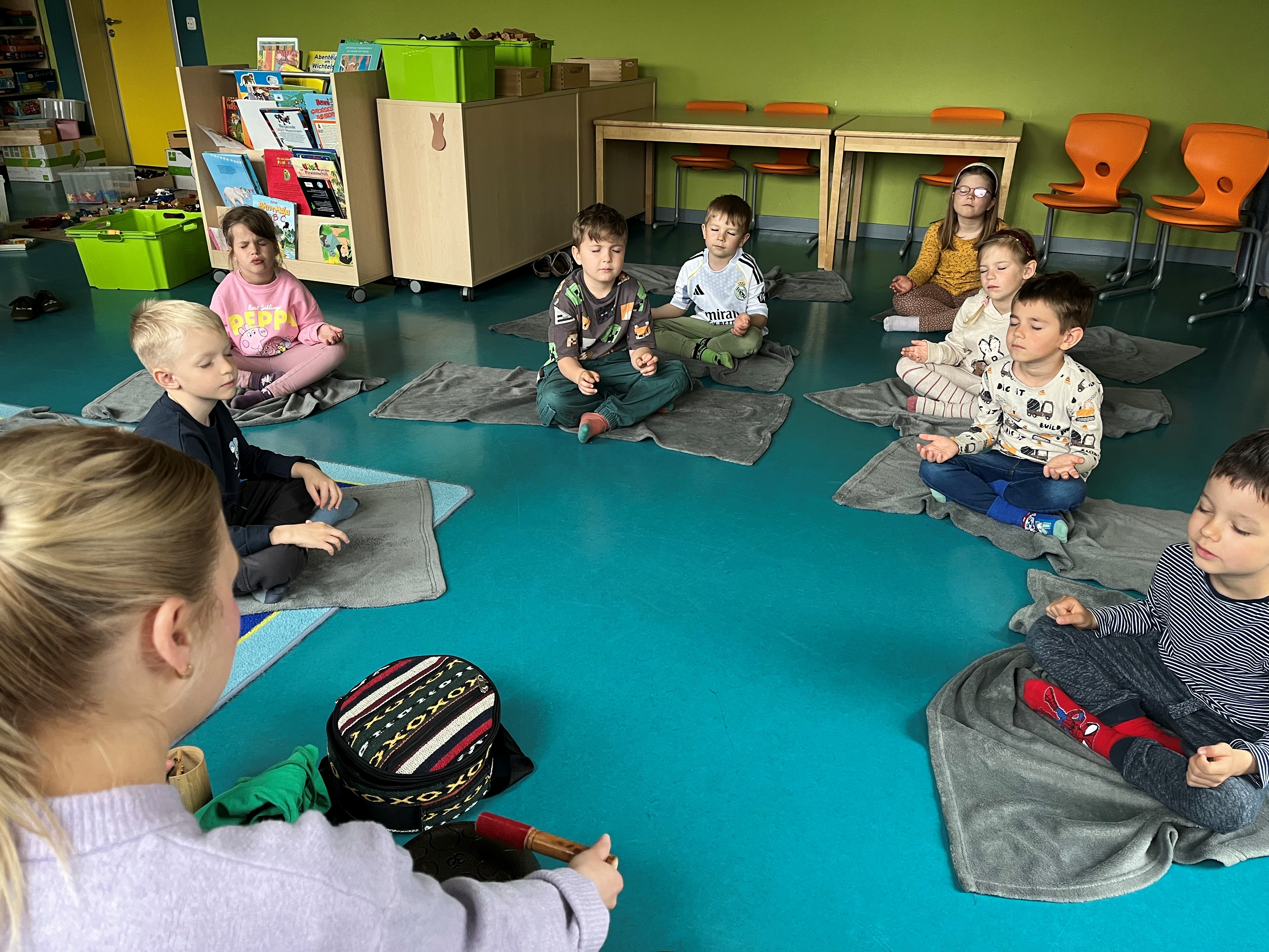 Gemeinsam wurden verschiedene Entspannungsangebote durchgeführt. Dazu gehörten ruhige Bewegungsübungen, kleine Fantasiereisen sowie kindgerecht angeleitete Atemübungen. Besonders eindrucksvoll waren auch die Einheiten mit Klängen und beruhigenden Geräuschen, die von den Kindern als sehr angenehm empfunden wurden.