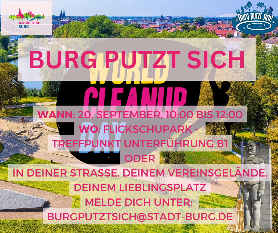 Am Samstag, den 20. September 2025, beteiligt sich die Stadt Burg am World Cleanup Day. Von 10:00 bis 12:00 Uhr sind alle Bürgerinnen und Bürger herzlich eingeladen, gemeinsam ein Zeichen für Sauberkeit und Umweltbewusstsein zu setzen.